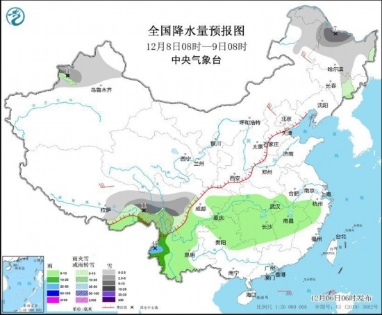 12月7日08時(shí)至8日08時(shí),內(nèi)蒙古東部、黑龍江中西部、新疆北部、西藏東部、川西高原南部、云南西北部等地部分地區(qū)有小到中雪或雨夾雪,其中,新疆伊犁河谷、西藏東南部等地局地有大到暴雪(10~12毫米)。西藏南部、四川南部、云南中西部、臺(tái)灣島等地部分地區(qū)有小到中雨,其中,云南西部局地有大雨(25~45毫米)。內(nèi)蒙古中部、新疆北疆等地部分地區(qū)有4~6級(jí)風(fēng)。