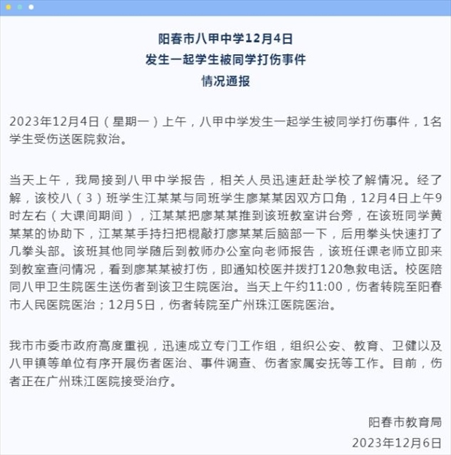 ·廣東陽(yáng)春一中學(xué)生疑被同學(xué)打成植物人?官方通報(bào):成立專門工作組。