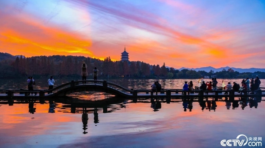 夕陽(yáng)西下,在杭州西湖景區(qū),晚霞染紅了天空和水面,與遠(yuǎn)處的雷峰塔構(gòu)成了一幅美麗的畫卷,吸引游客拍照打卡。