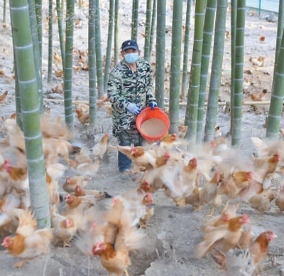 安吉縣利用良好生態(tài)優(yōu)勢發(fā)展林下養(yǎng)殖。圖為農(nóng)戶正給竹林雞喂食。夏鵬飛攝