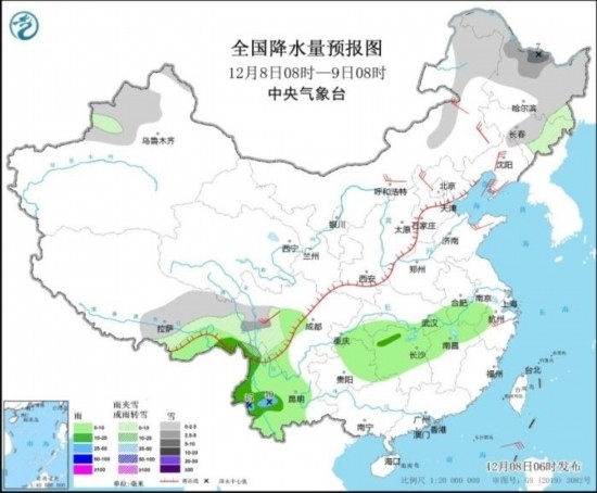 12月8日08時至9日08時,內(nèi)蒙古東北部、黑龍江、吉林中東部、遼寧北部、新疆北疆、西藏東部、川西高原西部等地部分地區(qū)有小到中雪或雨夾雪,其中,黑龍江北部局地有大雪(5~7毫米)。西藏南部、四川中西部、云南大部、重慶東南部、貴州東部和北部、湖南中北部、江西北部、湖北南部、安徽南部、浙江西部等地部分地區(qū)有小到中雨,其中云南西部局地有大雨(25~40毫米)。內(nèi)蒙古中東部、河北北部、遼東半島、山東半島、浙江東部等地部分地區(qū)有4~6級風。