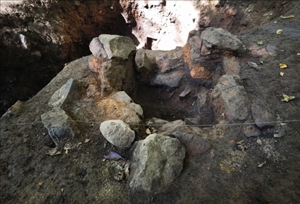 紅石砬子抗日根據(jù)地遺址,一處地窨子遺址的灶臺。新華社記者張博宇 攝