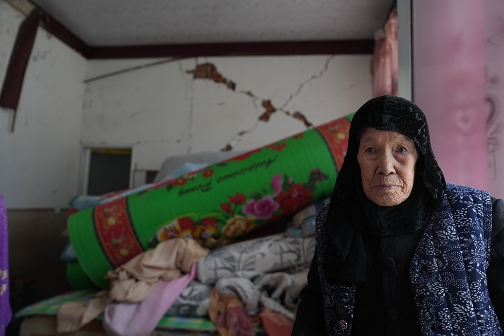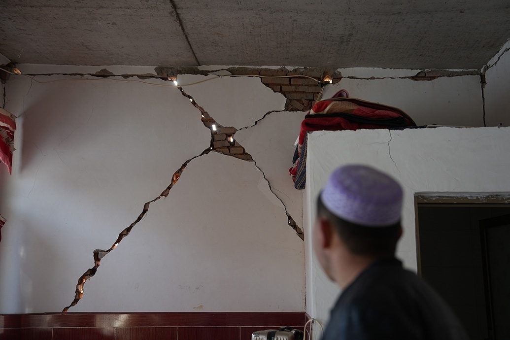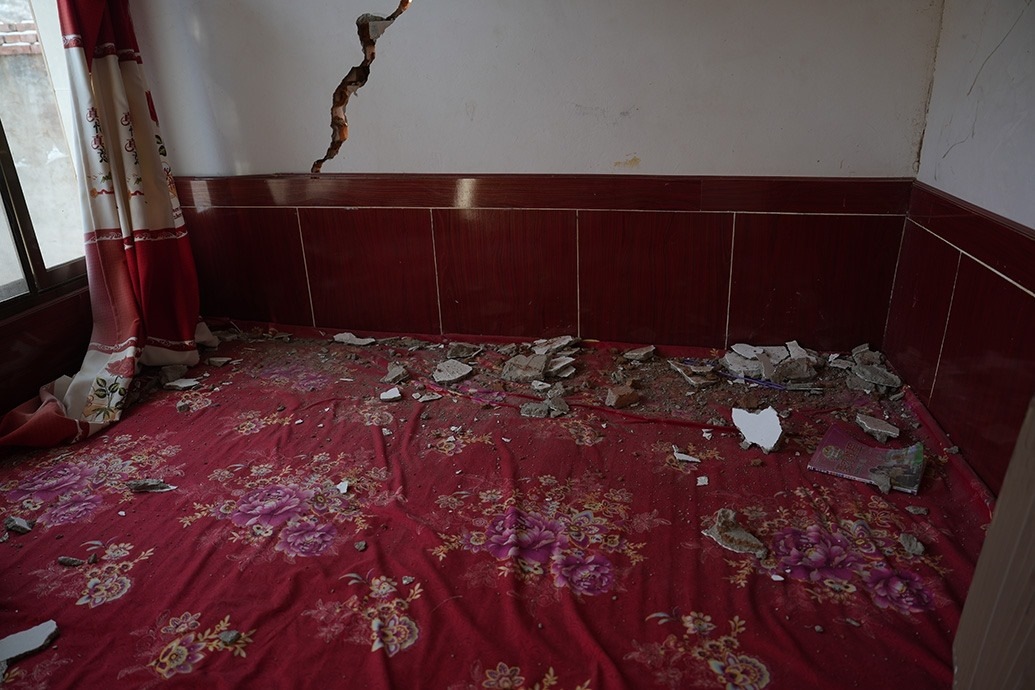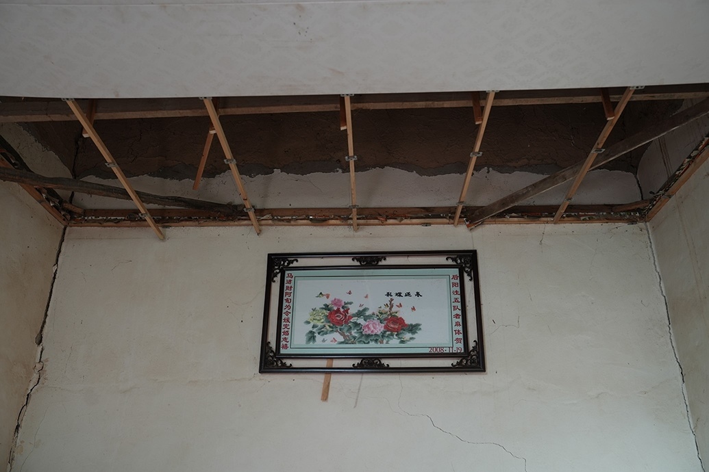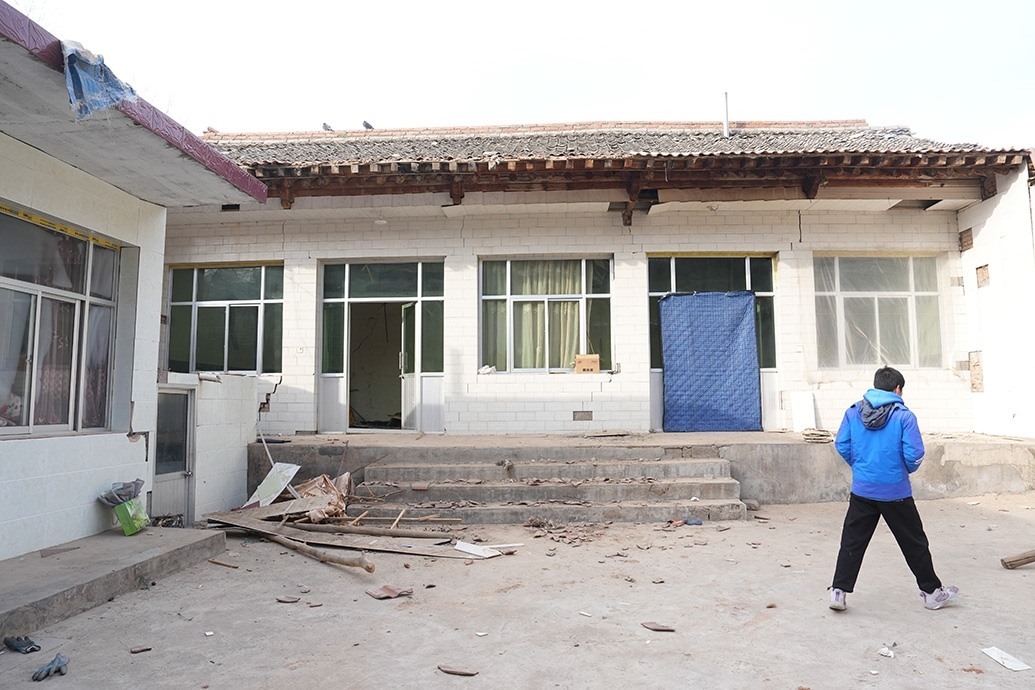 12月23日當(dāng)天,馬國忠和叔叔伯伯兩家都在家門前搭起剛領(lǐng)的帳篷。叔叔馬進(jìn)明家受損嚴(yán)重,兩堵磚墻的銜接處完全開裂,像條拉鏈被猛地拽下;天花板掉了大半,木頭架構(gòu)的屋頂赫然露在豁口里。所幸,他和家人平時(shí)在縣城租房住。