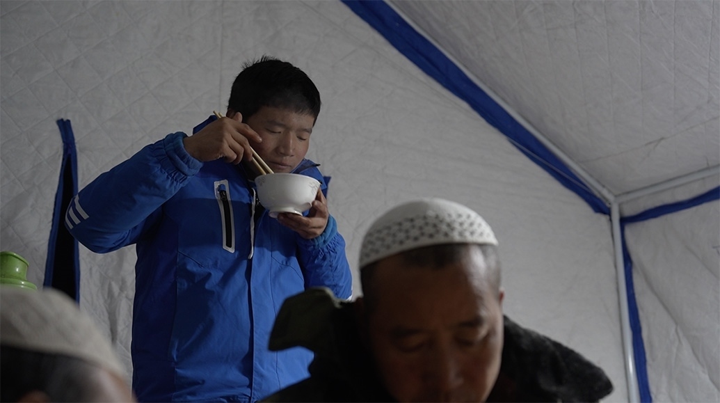 12月20日,馬國忠一家回到村里,拿塑料布在家附近搭了個(gè)簡易帳篷,兩根木頭、一條橫梁支起來,怕煙筒把塑料烤化,帳篷里不能烤火,頂多防風(fēng),但馬國忠覺得比車?yán)飶?qiáng)多了。家里的電熱毯拿出來鋪上,他才睡了個(gè)安穩(wěn)覺。只是半夜來了余震,又醒了。他止不住想:下一步怎么辦?后面會不會繼續(xù)搖?他家鋼管焊的牛棚頂晃得“乒乒乓乓”響。