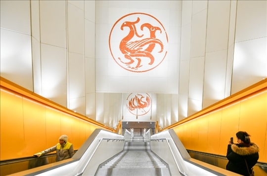 17號(hào)線太陽(yáng)宮站里,仿佛照射進(jìn)太陽(yáng)金光,站廳里的暖陽(yáng)壁畫(huà)、上下扶梯時(shí)墻壁上的神鳥(niǎo)瓦當(dāng),都有不少乘客舉著手機(jī)拍照。