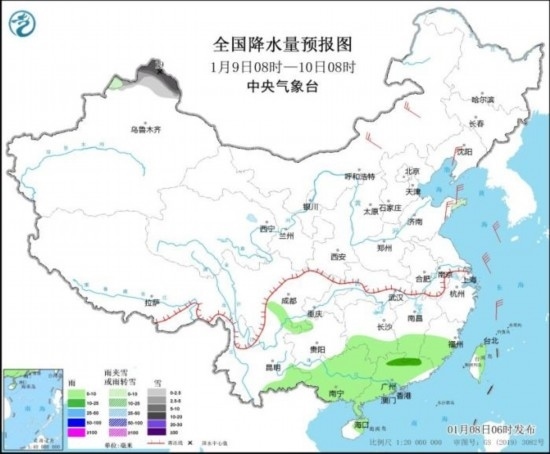 1月9日08時(shí)至10日08時(shí),新疆西北部有小到中雪或雨夾雪,部分地區(qū)有大雪或暴雪(10~19毫米)。四川盆地南部、云南東南部、江南南部、華南大部等地部分地區(qū)有小到中雨。內(nèi)蒙古中東部、遼寧、山東半島等地部分地區(qū)有4~5級風(fēng)。東海南部海域?qū)⒂?~7級風(fēng),陣風(fēng)8級。
