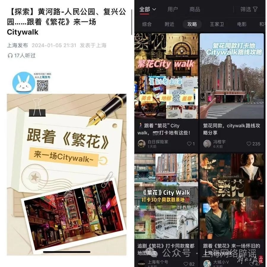 為此,上海辟謠平臺(tái)以“上海Citywalk”“繁花Citywalk”等為關(guān)鍵詞,搜索了多家旅游服務(wù)在線平臺(tái)、社交平臺(tái),都沒有發(fā)現(xiàn)主播們引用的“3公里Citywalk收費(fèi)520元”圖片,也沒有看到與“繁花Citywalk”相關(guān)的收費(fèi)服務(wù)。