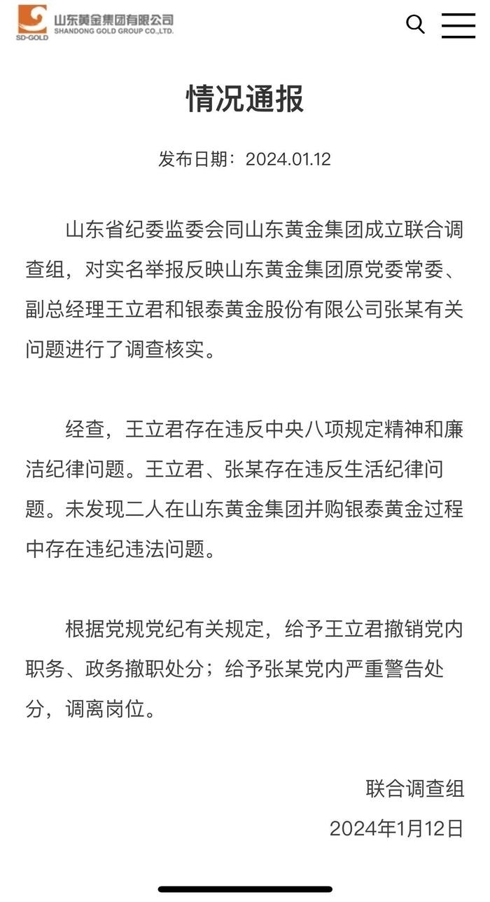 ·山東黃金集團(tuán)通報(bào)男子舉報(bào)妻子出軌國(guó)企領(lǐng)導(dǎo):給予王立君撤銷(xiāo)黨內(nèi)職務(wù)、政務(wù)撤職處分。