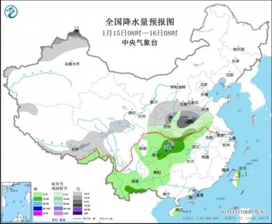 1月15日08時至16日08時,新疆西北部、西藏東部和南部、青海東南部、西北地區(qū)東部、華北南部、黃淮中西部等地部分地區(qū)有小到中雪或雨夾雪,其中,新疆西北部、陜西中部、山西南部、河南中北部等地部分地區(qū)有大雪或暴雪(10~14毫米)。安徽北部、湖北中西部、湖南西北部、貴州、云南大部、廣西西北部等地部分地區(qū)有小到中雨,其中,湖北西南部、重慶東部等地局地有大雨(25~40毫米)。內蒙古中部、遼東半島、山東半島等地部分地區(qū)有4~5級風。臺灣海峽、南海東北部海域將有6~7級風、陣風8~9級。