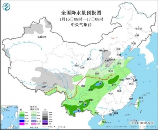 1月16日08時至17日08時,新疆北部、西藏中東部、青海南部、陜西中北部、華北南部和西部、黃淮西部和北部、川西高原、云南西北部等地部分地區(qū)有小到中雪或雨夾雪。黃淮南部、江淮大部、江漢、湖南西部和北部、西南地區(qū)大部、廣西西部等地部分地區(qū)有小到中雨,其中,湖北西南部、重慶東北部、云南南部等地局地有大雨(25~45毫米)。內蒙古中部、遼東半島等地部分地區(qū)有4~5級風。南海中北部海域將有6~7級風、陣風8~9級。