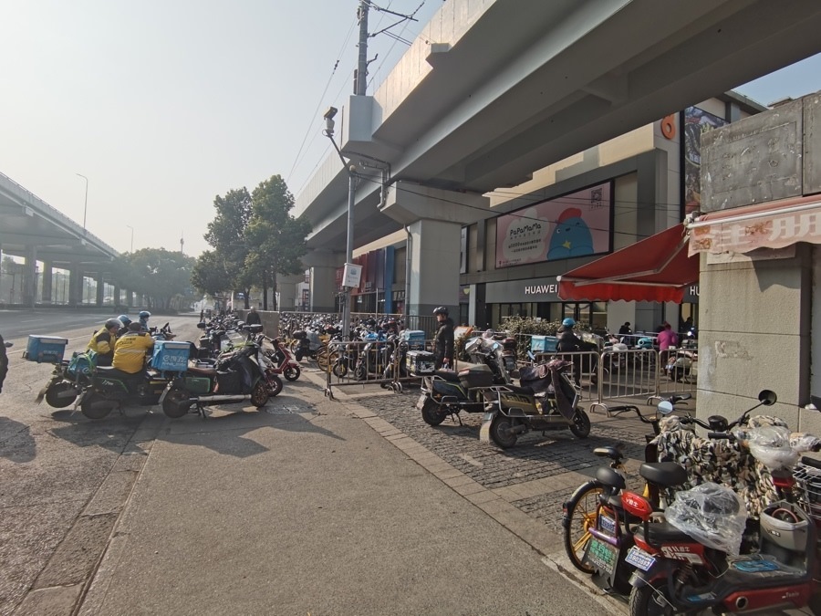 △“寶山新業(yè)坊”商圈外賣業(yè)務集中,圖為騎手們正在等單。