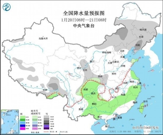 圖1 全國(guó)降水量預(yù)報(bào)圖(1月19日08時(shí)-20日08時(shí))