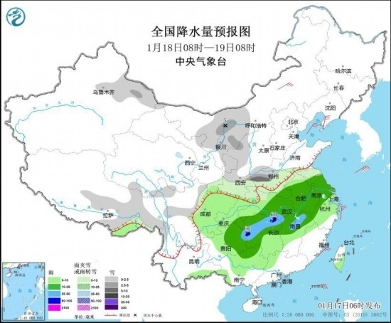 1月18日08時(shí)至19日08時(shí),內(nèi)蒙古西部、新疆北疆東部、西藏東部、西北地區(qū)東部、黃淮西部和南部、川西高原北部等地部分地區(qū)有小到中雪或雨夾雪,局地有大雪(5毫米)。江淮、江漢、江南北部和西部、西南地區(qū)東部、廣西等地部分地區(qū)有小到中雨,其中,湖南北部和西部、江西北部等地部分地區(qū)有暴雨(50~60毫米)。內(nèi)蒙古中部、遼東半島等地部分地區(qū)有4~6級(jí)風(fēng)(見(jiàn)圖2)。