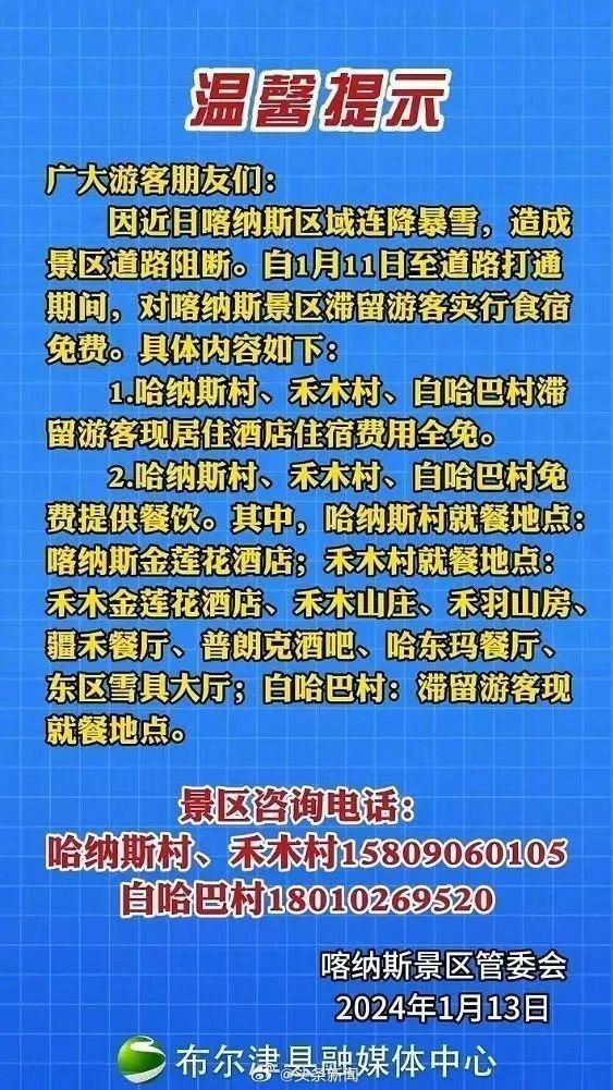 1月13日,喀納斯景區(qū)發(fā)布公告稱,對(duì)滯留游客實(shí)行食宿免費(fèi) 來源網(wǎng)絡(luò)