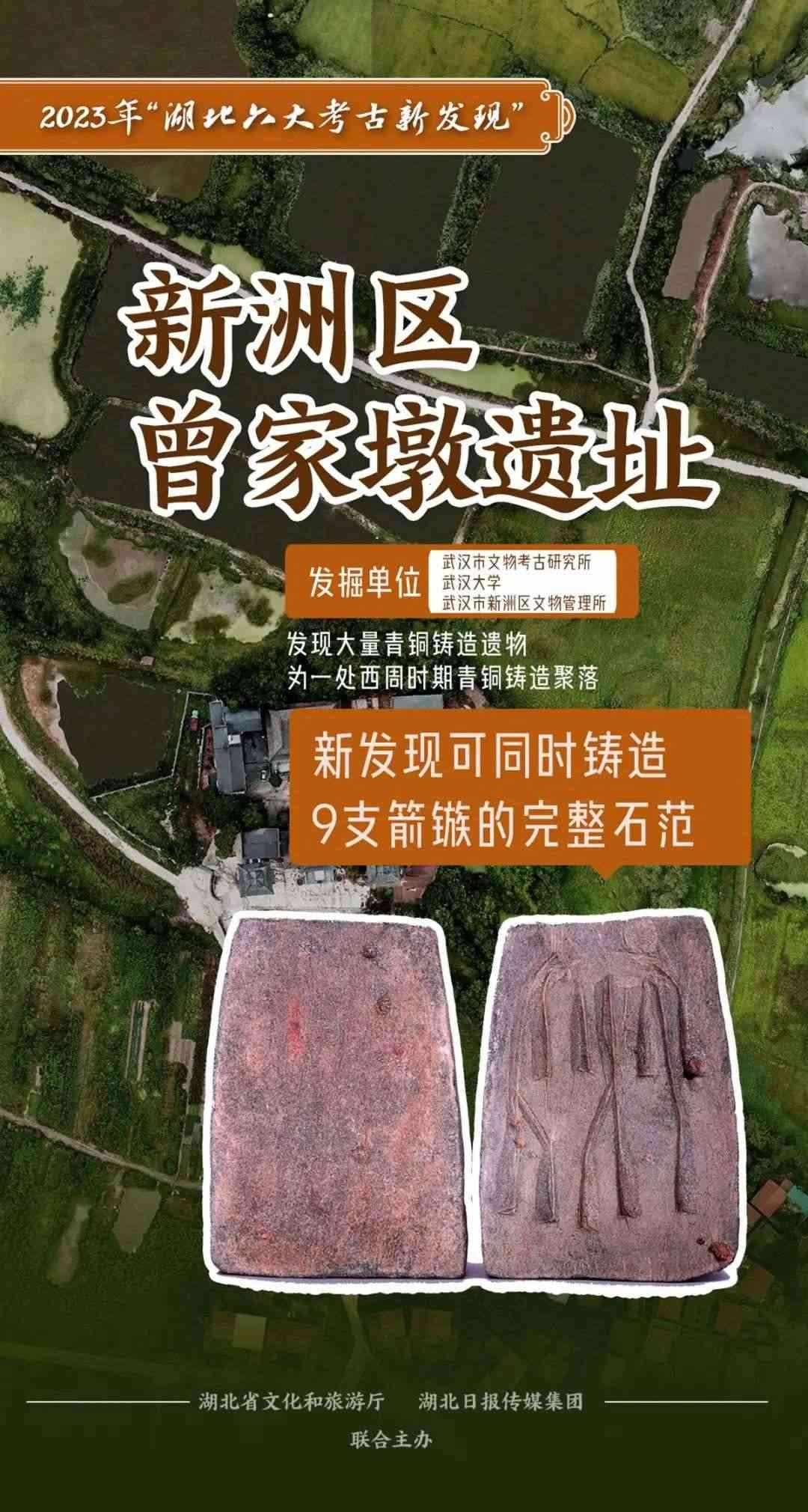 繼武漢黃陂盤龍城遺址小嘴遺址點(diǎn)、郭元咀遺址發(fā)現(xiàn)商代鑄銅遺存后,考古工作者在新洲曾家墩遺址新發(fā)現(xiàn)西周時期青銅鑄造遺存。遺址出土一塊用于鑄造青銅箭鏃的石范(即鑄造青銅器的石質(zhì)模具),保存完好,其完整程度在此前湖北地區(qū)考古中未曾發(fā)現(xiàn)。這塊石范可同時鑄造9支青銅箭鏃,具有相當(dāng)高的工藝水平。