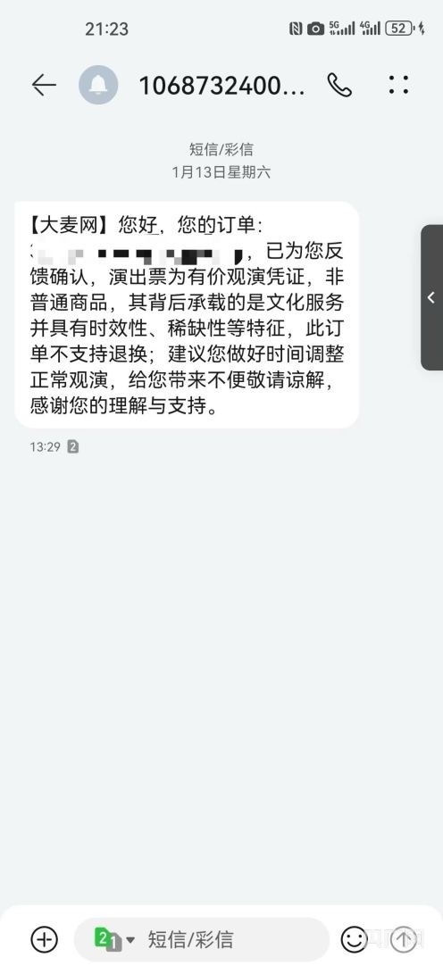 周女士說自己第一時間就通過多個渠道嘗試退票,但都沒有成功?!叭斯た头墓ぷ鲿r間是早上9點到晚上8點,我打電話的時候不在他們工作時間范圍內(nèi)。當(dāng)時也確實聯(lián)系不到其他渠道,于是我就在12315,包括黑貓投訴進行退票退款的申請。13號早上9點,大麥客服說此訂單不支持退換,13號下午1點半的時候,給了我一個反饋短信,說是已為我反饋確認(rèn),演出票為有價觀影憑證非普通商品,其背后承載的是文化服務(wù),并具有時效性、稀缺性等特征,此訂單不支持退換,然后就建議我做好時間調(diào)整正常觀演。”