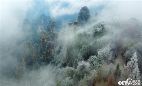 2024年1月20日,大寒節(jié)氣,張家界國家森林公園出現(xiàn)低溫冰雪天氣,天子山、袁家界、黃石寨一帶出現(xiàn)大面積霧凇冰掛景觀。