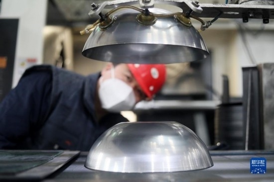 12月21日,在位于隆堯縣的河北三廈廚具科技有限公司生產(chǎn)車間,工人在操控旋壓設備。