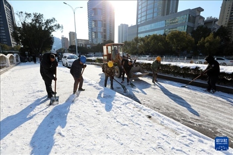 1月23日,在浙江省溫嶺市,人們在清除路面冰雪。近日,受寒潮天氣影響,我國多地迎來降溫降雪天氣,各地積極組織相關部門開展抗凝除雪工作,保安全保暢通。新華社發(fā)(周學軍攝)