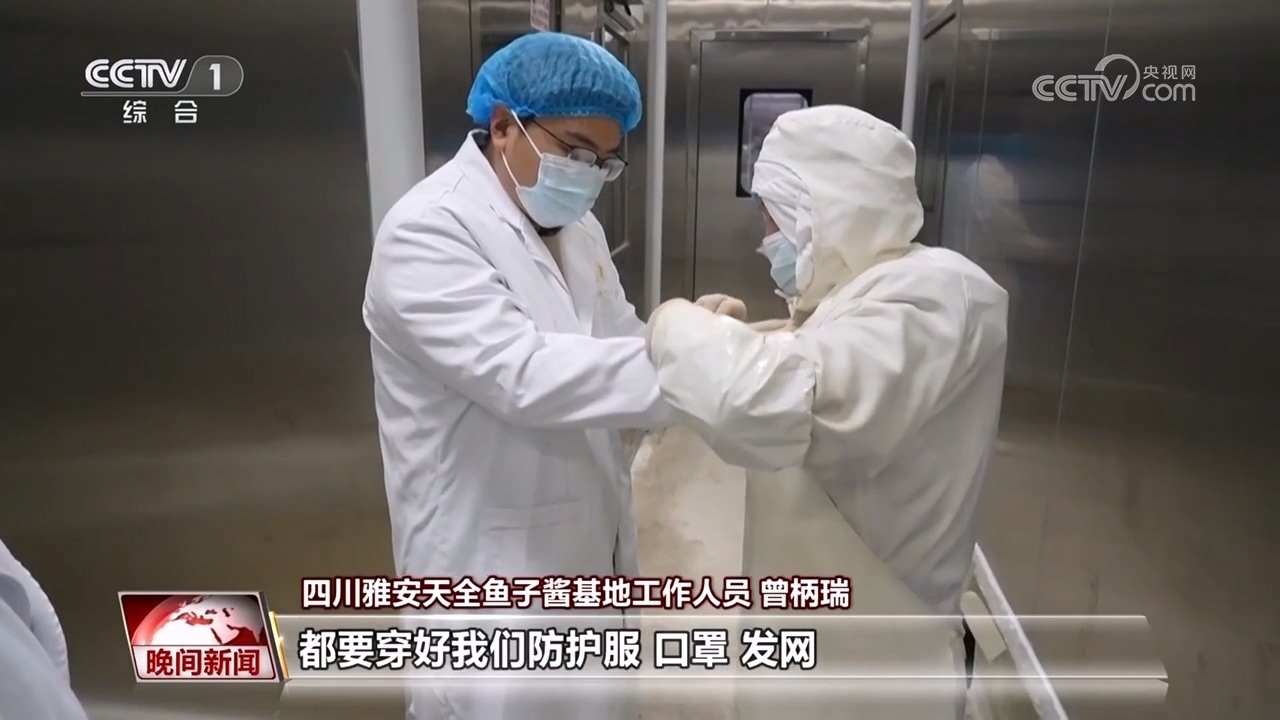 四川雅安天全魚子醬基地工作人員 曾柄瑞:每次進(jìn)加工車間都要穿好防護(hù)服、口罩、發(fā)網(wǎng),就像進(jìn)手術(shù)室一樣,經(jīng)過非常嚴(yán)格的消毒程序和控制,才能夠進(jìn)入加工車間。