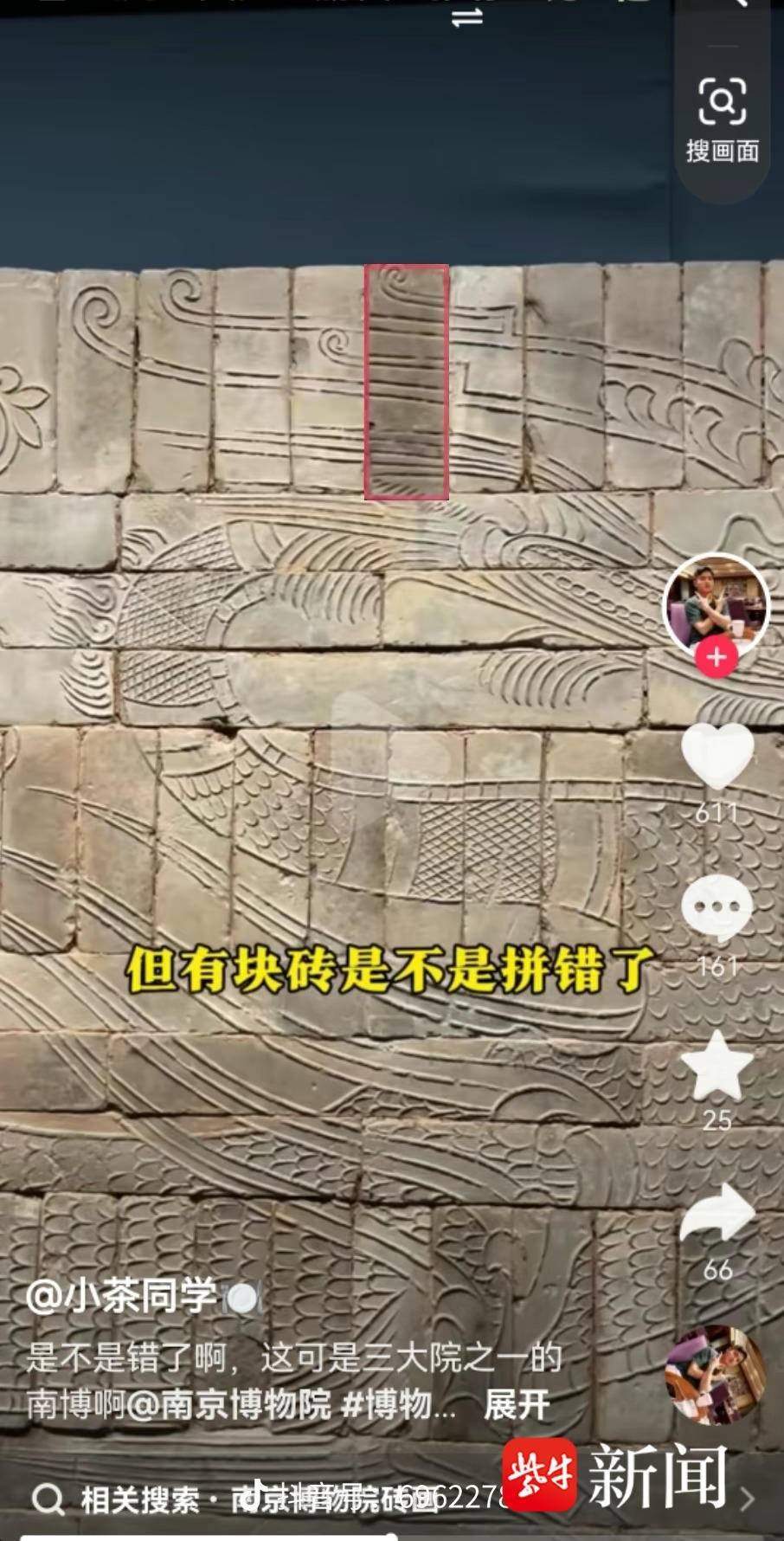 “家人們,我好像在南博發(fā)現(xiàn)了一件展品有一處錯誤”,網(wǎng)友“小茶同學(xué)”發(fā)視頻表示,“1月25日去南京博物院游覽,在看到《羽人戲龍磚畫》時,發(fā)現(xiàn)磚畫很精美,保留很完整。磚畫上的陽刻線條尤其讓我感到震撼,看到深色磚的部分,我感覺有點(diǎn)別扭,當(dāng)時就臆想著那塊磚反過來是不是更好一點(diǎn),于是發(fā)了一個視頻求助?!?/p>