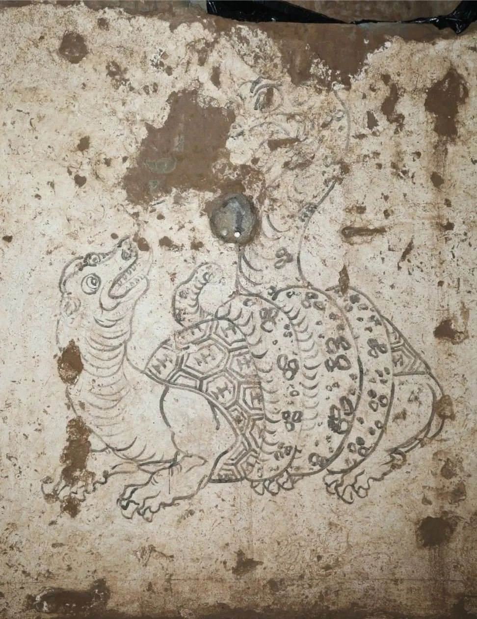 墓道處壁畫保存較差,僅墓道口處保留有少量畫面,兩壁分別為青龍、白虎圖樣;甬道兩側(cè)分別繪有三個侍女,僅存下半身;墓室東壁為樂舞圖,呈三段式布局,其中南側(cè)為十人組成的樂隊,中部為女舞者,北部為觀看的貴婦(應(yīng)為墓主)及侍女;墓室北壁東側(cè)中心為一坐于方形高背扶手椅貴婦(應(yīng)為墓主),兩側(cè)站立有侍女,應(yīng)為表現(xiàn)墓主日常生活場景;墓室北壁西側(cè)為玄武圖,形象巨大,十分靈動;墓室西壁為六扇屏花草,畫面簡單且潦草;墓室南壁為朱雀,呈雙翅展開欲騰飛狀。該墓壁畫布局充實完整,畫面惟妙惟肖,內(nèi)容上有一定程度反映了墓主生前生活,體現(xiàn)出墓主情趣高雅,深居簡出,柔貞以靜好,有美婦之懿烈兼瞿母之慈仁。墓葬壁畫整體上風(fēng)格及年代與讓皇帝李憲墓極為相近,或為共用一粉本所繪制。