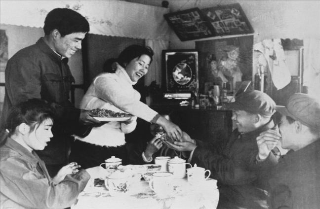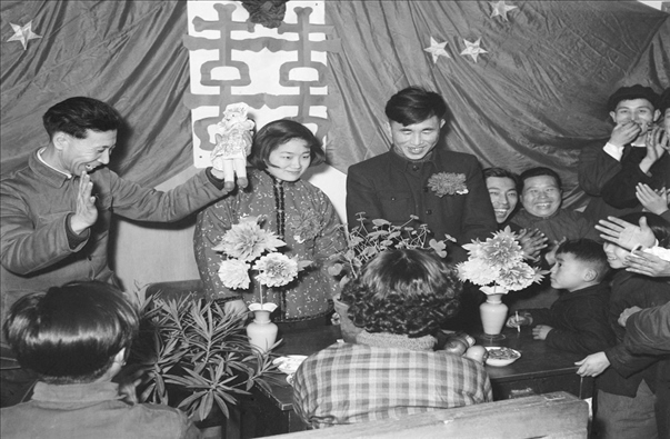 1957年春節(jié),遼寧省沈陽風(fēng)動(dòng)工具廠的工人鞠復(fù)海(新郎)和俞鳳仙(新娘)在婚禮儀式上接受朋友們的祝賀。