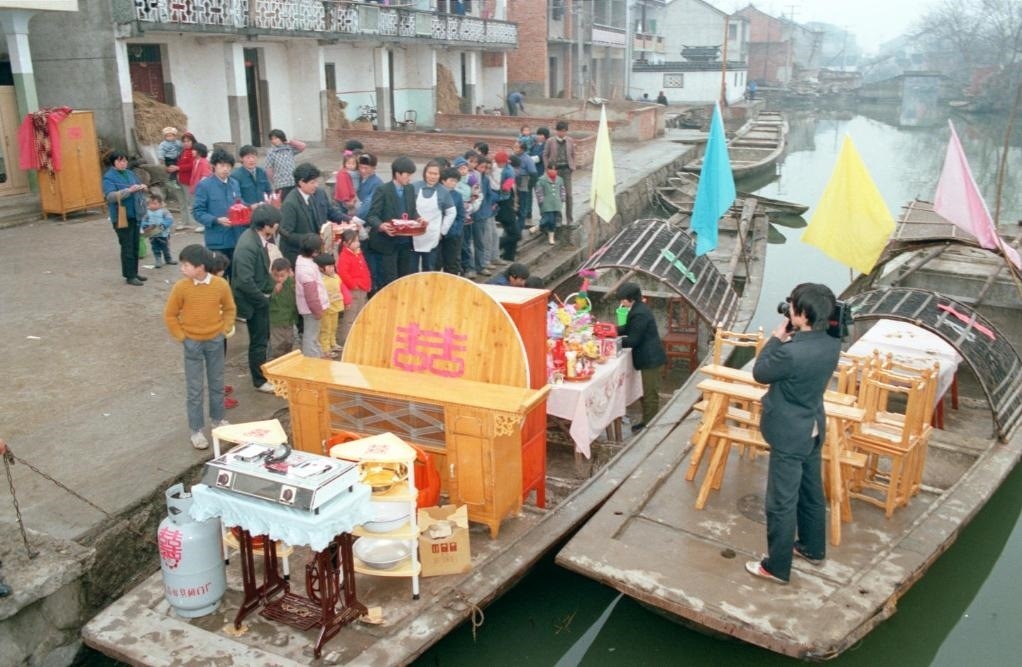 1990年春節(jié)前夕,紹興紅江村的章如花嫁到了一里外的檀瀆村。新郎迎娶新娘所用的交通工具,不是汽車,也不是花轎,而是水鄉(xiāng)里常見的船。富裕起來的水鄉(xiāng)農(nóng)民在遵循傳統(tǒng)禮儀的同時(shí),也為婚禮增添了現(xiàn)代色彩。比如,陪嫁中少不得電視、煤氣罐;新娘少不得燙發(fā);另一件少不得的,是用攝像機(jī)記錄下婚禮的全部過程,作為一輩子的紀(jì)念。