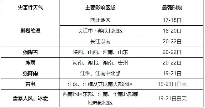 央視網(wǎng)消息:中央氣象臺預計,2月17日至22日寒潮天氣將影響我國,中東部地區(qū)氣溫起伏劇烈,大部地區(qū)降溫10~18℃,局地氣溫降幅可達20℃以上;全國大部有明顯雨雪天氣,其中陜西、山西、河南、山東等地有暴雪,局地大暴雪;河南、湖北、湖南、貴州將先后出現(xiàn)凍雨;江淮、江南中北部局地有暴雨,南方地區(qū)有大范圍雷電和局地強對流天氣。