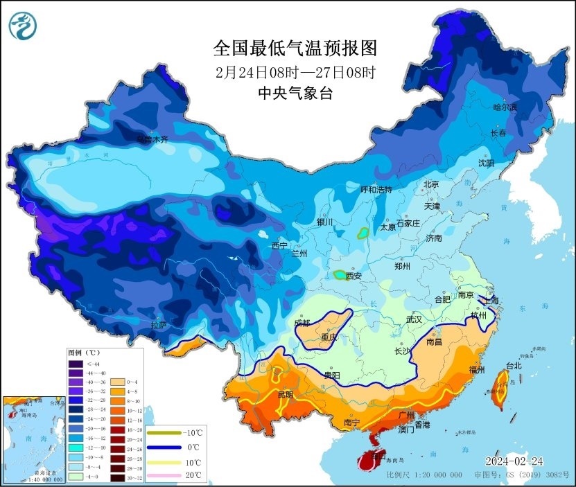 預計,2月24日08時至27日08時,江淮中西部、江漢大部、江南中部和西部、西南地區(qū)東部和北部、廣西、廣東北部以及陜西東南部、甘肅東南部、新疆沿天山地區(qū)、西藏南部等地的日平均氣溫較歷史同期偏低5℃以上,其中,湖北中部和南部、湖南大部、江西中部、貴州大部、廣西中北部、四川中西部、新疆沿天山地區(qū)等地的日平均氣溫較歷史同期偏低7℃以上,最低氣溫0℃線將位于貴州西南部、廣西北部、江西北部至江蘇南部一帶。