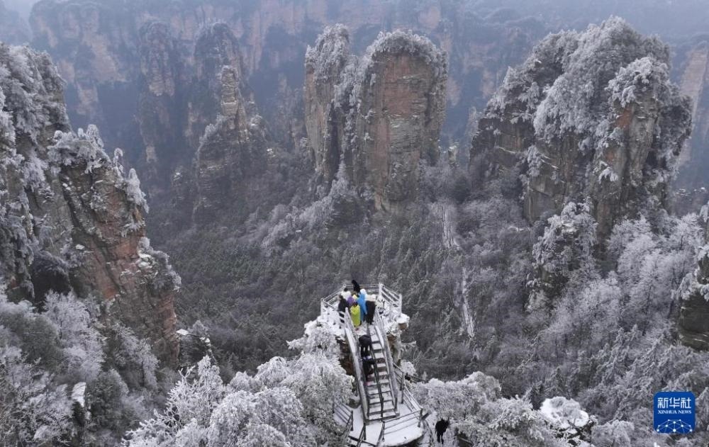 近日,湖南張家界迎來降雪天氣,雪后的張家界國家森林公園銀裝素裹,美景如畫,引人入勝。