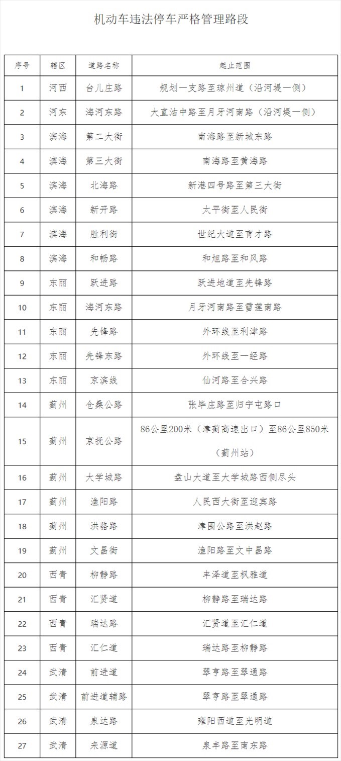 為進(jìn)一步加強(qiáng)天津市道路交通安全管理,規(guī)范靜態(tài)交通秩序,提高道路通行能力,根據(jù)《中華人民共和國(guó)道路交通安全法》及其實(shí)施條例等有關(guān)法律法規(guī)規(guī)定,天津市公安交通管理局根據(jù)道路通行實(shí)際情況,決定自2024年3月18日起,將下列27條路段設(shè)置為機(jī)動(dòng)車違法停車嚴(yán)格管理路段。機(jī)動(dòng)車在嚴(yán)格管理路段內(nèi)違法停放的,公安交管部門將在提醒糾正的同時(shí)依法予以處罰。