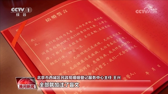 北京市西城區(qū)民政局婚姻登記服務(wù)中心主任 王興:我們通過(guò)這次活動(dòng)也是跟盲文出版社正式把這個(gè)結(jié)婚登記的告知單,還有結(jié)婚誓言,全部就加注了盲文,等以后再有相同需求的殘疾人到我們婚姻登記(服務(wù)中心)登記結(jié)婚,我們會(huì)給他們提供一套相應(yīng)的流程。