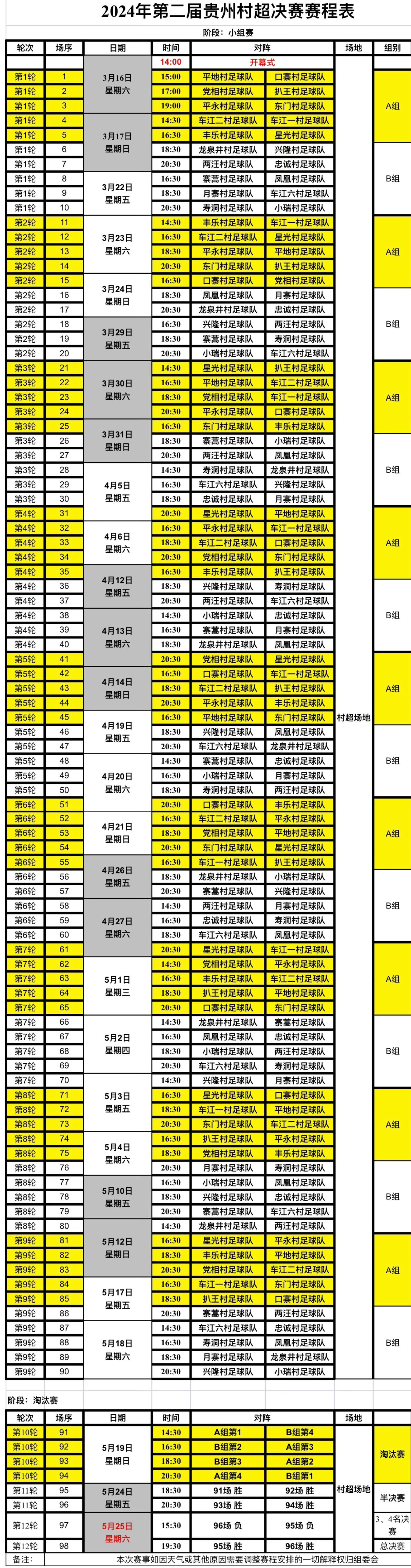 決賽階段的“村超”從3月16日開始,每周五到周日都會保證有比賽,逢節(jié)假日還會舉行加賽。球迷們只要在出發(fā)前記得確認(rèn)一下賽程表即可。建議可以上午先到當(dāng)?shù)赜斡[,體驗民俗文化,晚上再去觀看“村超”賽事。