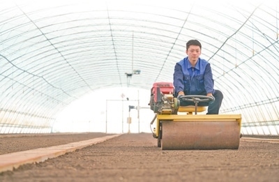 黑龍江北大荒農(nóng)業(yè)股份有限公司友誼分公司智慧農(nóng)場育秧大棚里,職工在進行水稻育秧前的地面平整作業(yè)。新華社記者 王 松攝