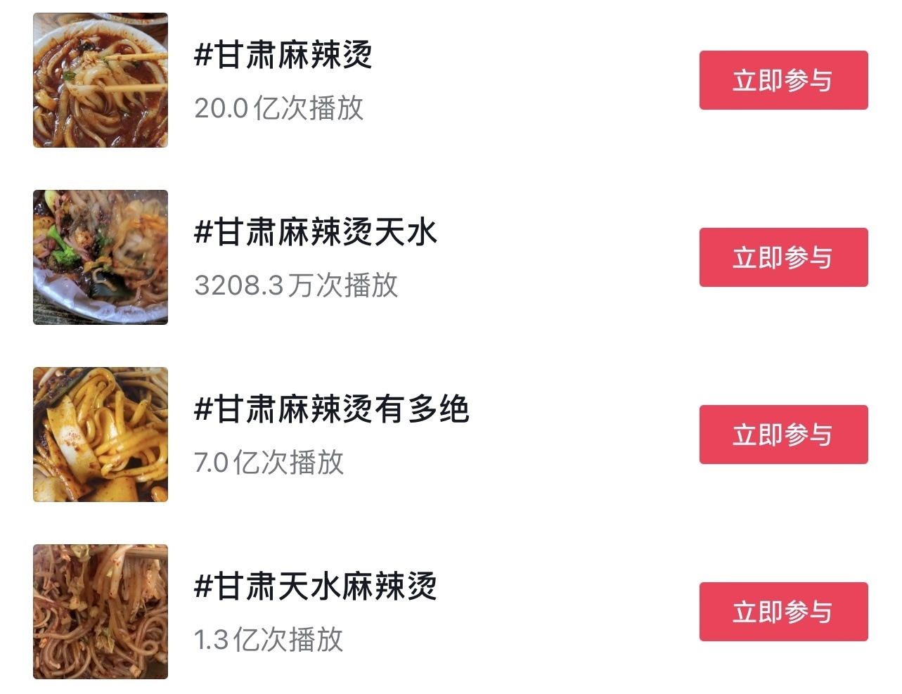 “這兩條視頻吸引了大量網(wǎng)民觀(guān)看、點(diǎn)贊、轉(zhuǎn)發(fā),之后陸續(xù)有網(wǎng)民發(fā)布相關(guān)視頻。”3月18日,甘肅省文化和旅游廳在回復(fù)網(wǎng)友建議中提到,3月份以來(lái),“甘肅麻辣燙”話(huà)題迅速發(fā)酵,視頻內(nèi)容迅速增加,多次登上抖音、快手等短視頻平臺(tái)熱榜。截至3月16日18:00,各大短視頻平臺(tái)上“甘肅麻辣燙”相關(guān)話(huà)題累計(jì)播放量已超過(guò)32.6億次。