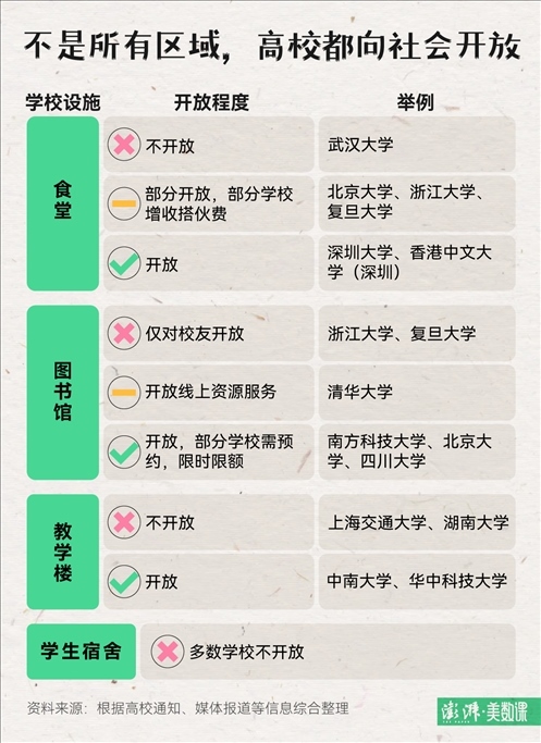 最令在校學生頭疼的要與游客爭搶學校資源的問題,例如食堂、圖書館和教學樓等,各個學校在決定開放校園的同時也給出了相關規(guī)定。