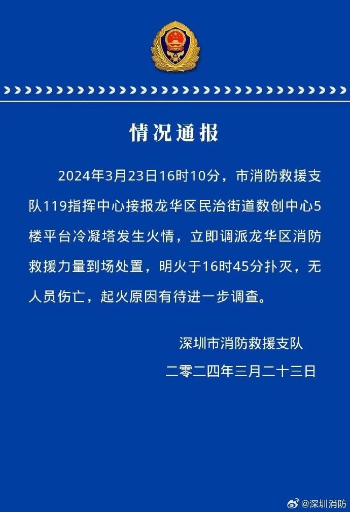 央視網(wǎng)消息:深圳市消防救援支隊(duì)發(fā)布情況通報(bào),2024年3月23日16時(shí)10分,市消防救援支隊(duì)119指揮中心接報(bào)龍華區(qū)民治街道數(shù)創(chuàng)中心5樓平臺(tái)冷凝塔發(fā)生火情,立即調(diào)派龍華區(qū)消防救援力量到場處置,明火于16時(shí)45分撲滅,無人員傷亡,起火原因有待進(jìn)一步調(diào)查。
