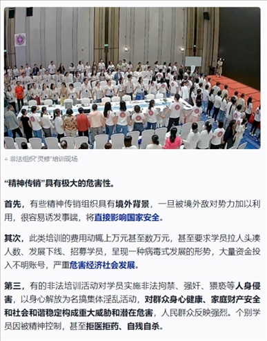 ·起底被公安機關打擊查處的“靈修”組織:打著“靈修”“靈魂塑造”等旗號,對學員實施精神控制;借“靈修”提升之名,行“精神傳銷”之實。鄧海鵬及其創(chuàng)辦的培訓機構,打著“靈魂塑造”“集體場域”的幌子,對學員進行精神控制,然后以傳銷、加盟、進階等現代營銷模式達到斂財漁色目的。人前他要求學員全部吃素,自己每天大魚大肉,必吃海參;人前他要求學員不能有不動產、錢是修行來的,自己卻拿著騙來的錢去買理財產品;人前他無兒無女,實則有妻有女;人前假裝不近女色,背地里卻漁色女學員。
