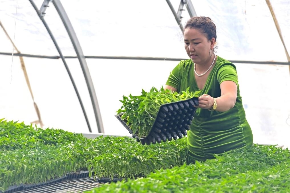 三月將盡,大漠乍暖還寒。坐落于戈壁灘邊緣的一座座溫室大棚內(nèi)滿目翠綠、暖意融融,米哈熱古麗·艾合麥提在一盤盤秧苗間麻利穿梭,額頭上的汗珠不時(shí)滾落。