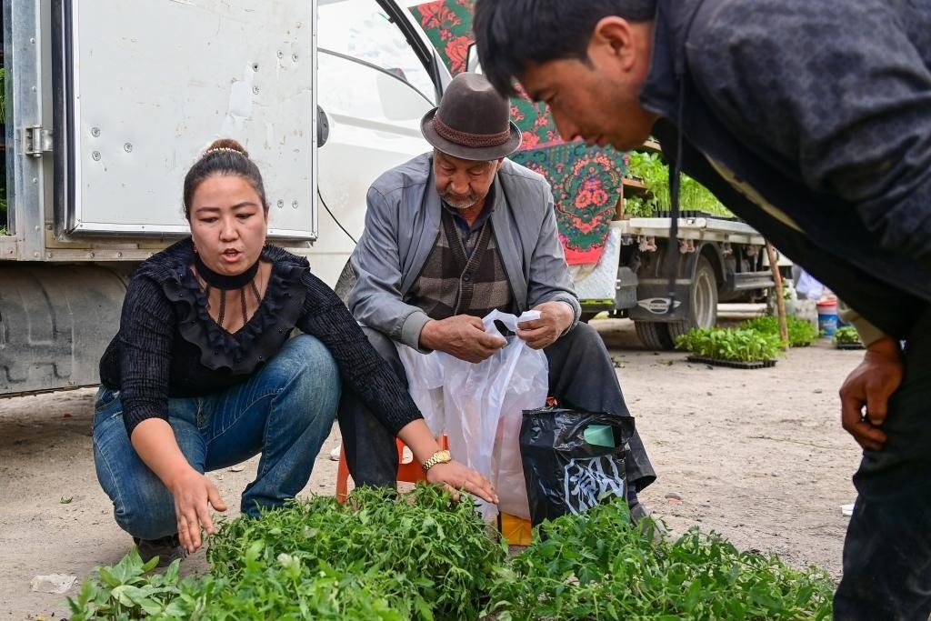在新疆阿克蘇地區(qū)溫宿縣克孜勒鎮(zhèn),種植戶米哈熱古麗·艾合麥提(左)在巴扎上介紹自己培育的菜苗(3月25日攝)。新華社記者 丁磊 攝
