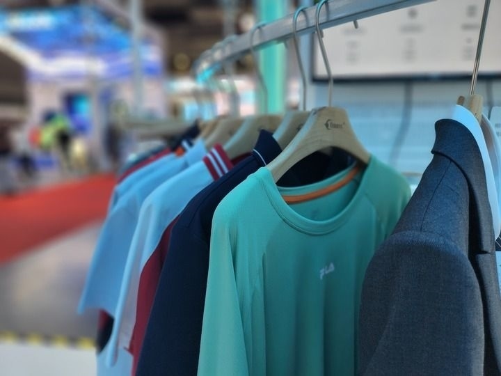 2023年6月13日拍攝的首屆上海國(guó)際碳博會(huì)上凱賽生物展示的生物基聚酰胺纖維產(chǎn)品制成的服飾。新華社記者 王默玲 攝