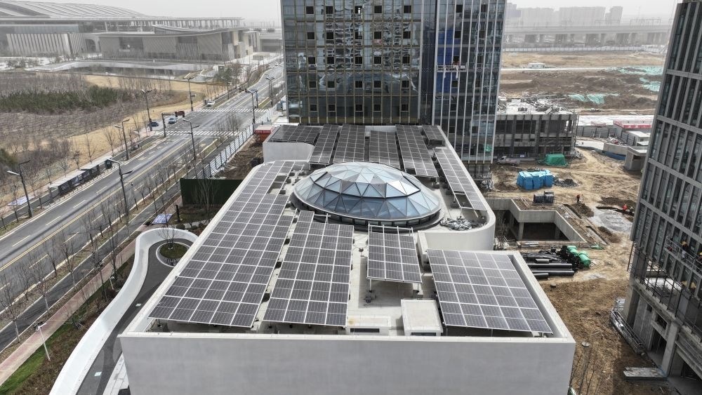 ↑雄安自貿(mào)試驗(yàn)區(qū)交流展示中心是首批通過新區(qū)專家評審的零碳示范建筑,這是該中心屋頂?shù)墓夥l(fā)電設(shè)施(3月28日攝,無人機(jī)照片)。