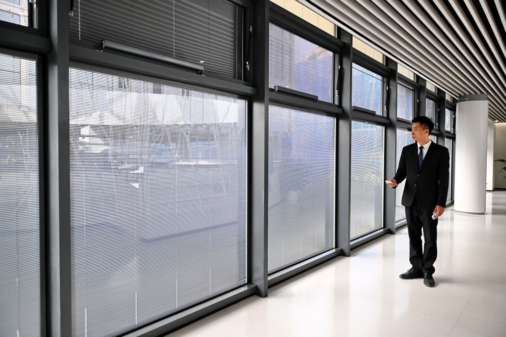 ↑3月28日,雄安自貿(mào)試驗(yàn)區(qū)交流展示中心的工作人員在展示兼具保溫與遮陽效果的鍍膜玻璃,該中心是首批通過新區(qū)專家評審的零碳示范建筑。
