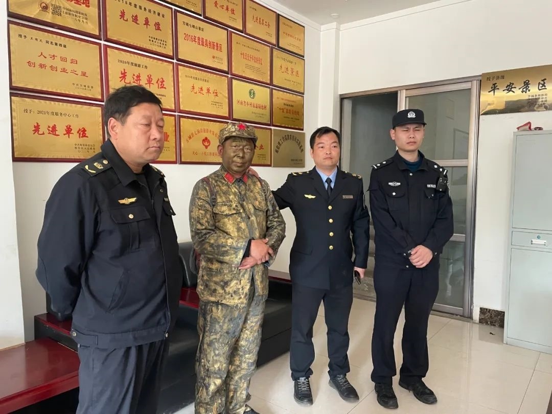 4月6日早晨開始,景區(qū)組織了大量安保人員在景區(qū)全范圍內進行拉網式排查,上午10點左右,在景區(qū)“玉女湖”景點附近發(fā)現(xiàn)了正在換裝的“銅人”與“孫悟空”兩位男子。景區(qū)第一時間向縣文廣旅局以及縣公安局上報說明,相關工作人員第一時間趕到現(xiàn)場,經縣文旅執(zhí)法與公安人員現(xiàn)場詢問:“銅人”與“孫悟空”均說明是其自行買票進入景區(qū)內,與游客合照誘導消費的行為均屬于個人行為,與七峰山景區(qū)無關。目前該兩名男子已被公安局執(zhí)法人員帶走進行進一步調查。