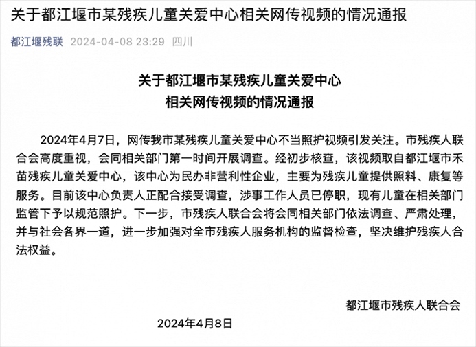 ·都江堰一康復(fù)中心殘障兒童被老師打罵?官方通報:涉事人員已停職。