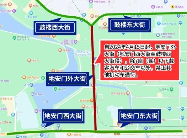為確保全國重點文物保護單位“大運河——玉河故道(澄清上閘含萬寧橋)”的文物安全與交通安全,根據文物保護和道路交通安全有關法律法規(guī)規(guī)定,決定自2024年4月15日起,地安門外大街(地安門西大街至鼓樓西大街段),除7座(含)以下載客汽車和公交車以外,禁止其他機動車通行。