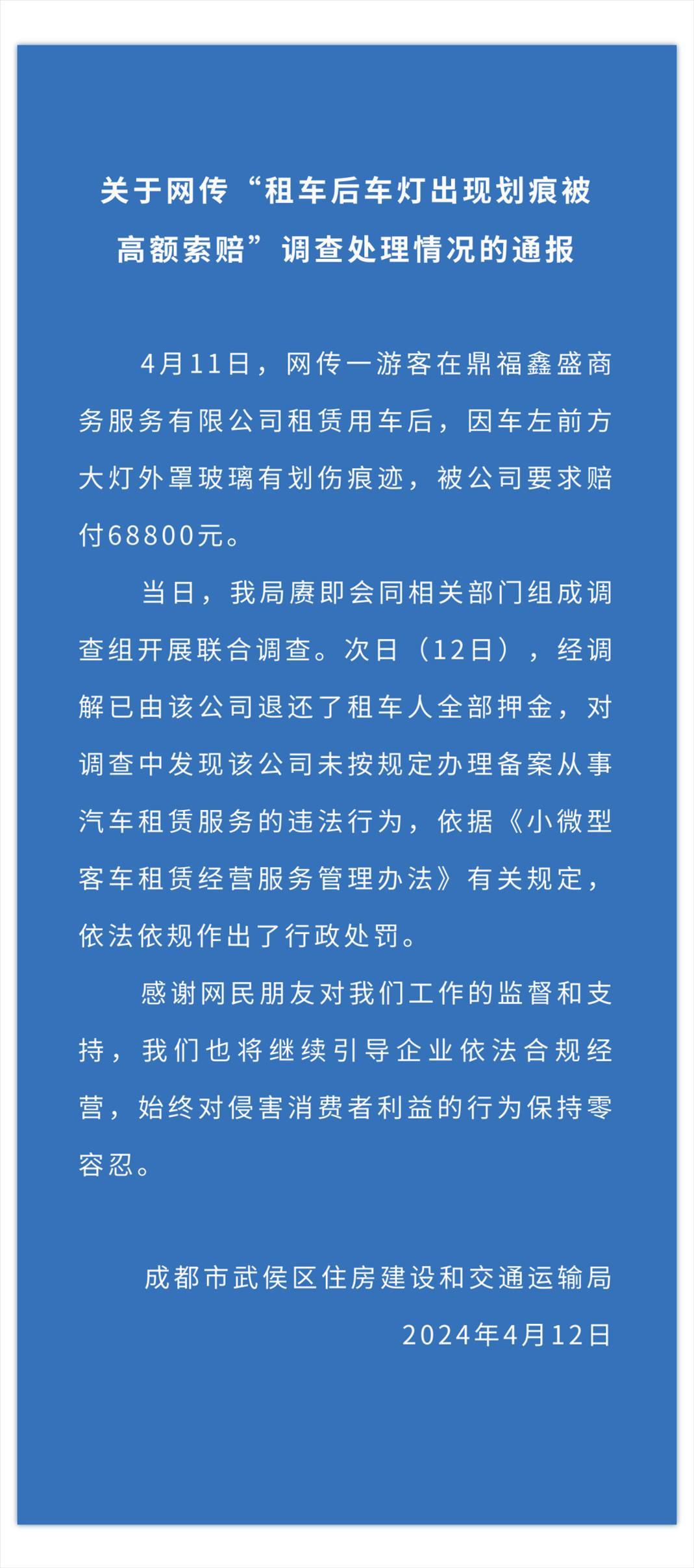央視網(wǎng)消息:成都市武侯區(qū)住房建設(shè)和交通運(yùn)輸局4月12日晚發(fā)布通報(bào),4月11日,網(wǎng)傳一游客在鼎福鑫盛商務(wù)服務(wù)有限公司租賃用車后,因車左前方大燈外罩玻璃有劃傷痕跡,被公司要求賠付68800元。當(dāng)日,我局賡即會(huì)同相關(guān)部門組成調(diào)查組開展聯(lián)合調(diào)查。次日(12日),經(jīng)調(diào)解已由該公司退還了租車人全部押金,對調(diào)查中發(fā)現(xiàn)該公司未按規(guī)定辦理備案從事汽車租賃服務(wù)的違法行為,依據(jù)《小微型客車租賃經(jīng)營服務(wù)管理辦法》有關(guān)規(guī)定,依法依規(guī)作出了行政處罰。
