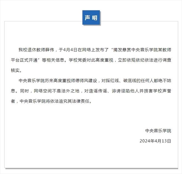 ·中央音樂學院回應學校系主任被舉報:立即調查,絕不姑息。