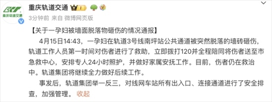 央視網(wǎng)消息:據(jù)@重慶軌道交通 微博通報(bào),4月15日14:43,一孕婦在軌道3號線南坪站公共通道被突然脫落的墻磚砸傷,軌道工作人員第一時間對傷者進(jìn)行了救助,立即撥打120并全程陪同將傷者送至市急救中心,安排專人24小時照護(hù),并做好家屬安撫工作。目前,傷者仍在救治中。軌道集團(tuán)將繼續(xù)全力做好后續(xù)工作。